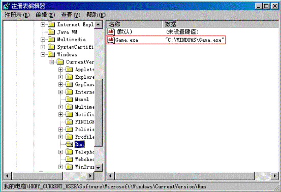 在9X下,灰鸽子启动项只有一个,因此清除更为简单。运行注册表编辑器,打开HKEY_CURRENT_USERSoftwareMicrosoftWindowsCurrentVersionRun项,我们立即看到名为Game.exe的一项,将Game.exe项删除即可。(图6)