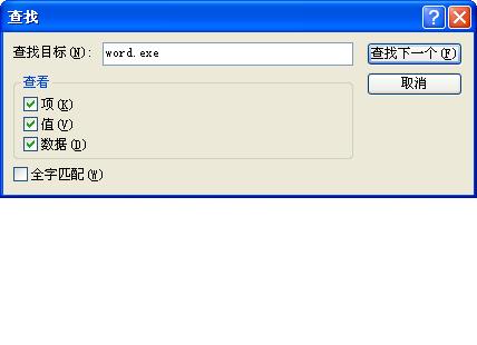 查找:打开注册表编辑器后,选择"编辑——查找"输入要查找的项、值或数据。然后按查找。(参见图3)如果第一个找到的不是我们想要的,可以按F3(查找下一个),直到找到为止。(注:在“查找”对话框中有3个查看项可以选,即“项、值、数据”还有“全字匹配”用户可以自行选择)