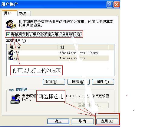 新立一个用户,再在“开始”→“运行”→输入“control.exe userpasswords2”进入“用户帐户”再按如下图所示的操作方式即可。
