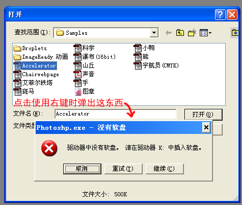 在ps里打开的文件的对话框里使用右键时老出现一个"photoshp.exe-没有软盘"的对话框,内容是说:驱动器里没有软盘,请在驱动器K:中插入软盘!然后下面三个选项:取消、重试、继续!要连续按几下取消才能关闭这个对话框!然后才弹出右键菜单,才能对文档进行复制粘贴等操作~几乎每次在ps打开文件的对话框里使用右键都会出现这种情况!