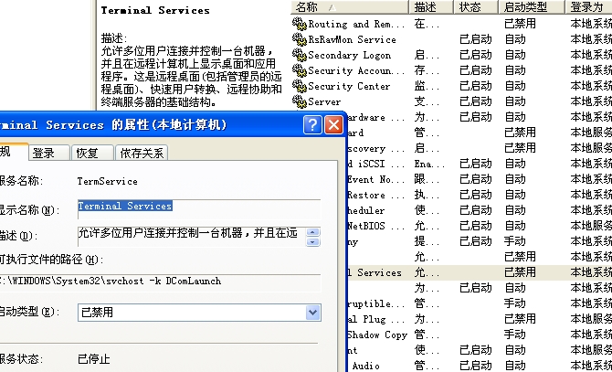 【侠客行难的贴子】呵呵 ,问题已解决,毛病出在把服务里的“Terminal Services”项禁用了,估计是系统优化时,出的问题。