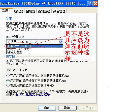 可能是你的显示的字体选择过大或过小,如图中的“DPI设置”过大了?应设为正常尺寸为图中红框的好,试试下面方式鼠标指到桌面空白处击右键→“属性”→如下图所示