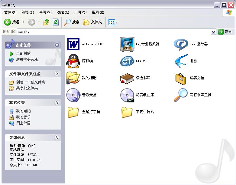 偶的D盘驱动器盘符图标正常,只是打开D盘后根目录象是音乐文件夹,而在D盘上创建的文件象是在音乐文件夹下建的文件.D盘上不是音乐文件夹的文件打开后又是正常的.
