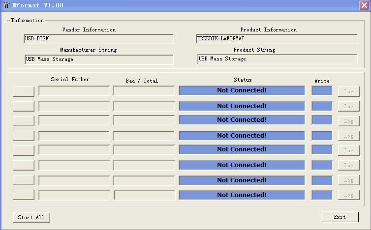 装上U盘(如果你的机器已经无法认出U盘就没有办法了),运行Mformat.exe,应该显示蓝色的status-ready 和write-ready。点击这一行前面的“H”按钮开始格式化,大概30秒左右即可完成。看看你的U盘,是不是又可以用了啊?呵呵!还有一些高级用法,大家自己用google搜索一下吧!