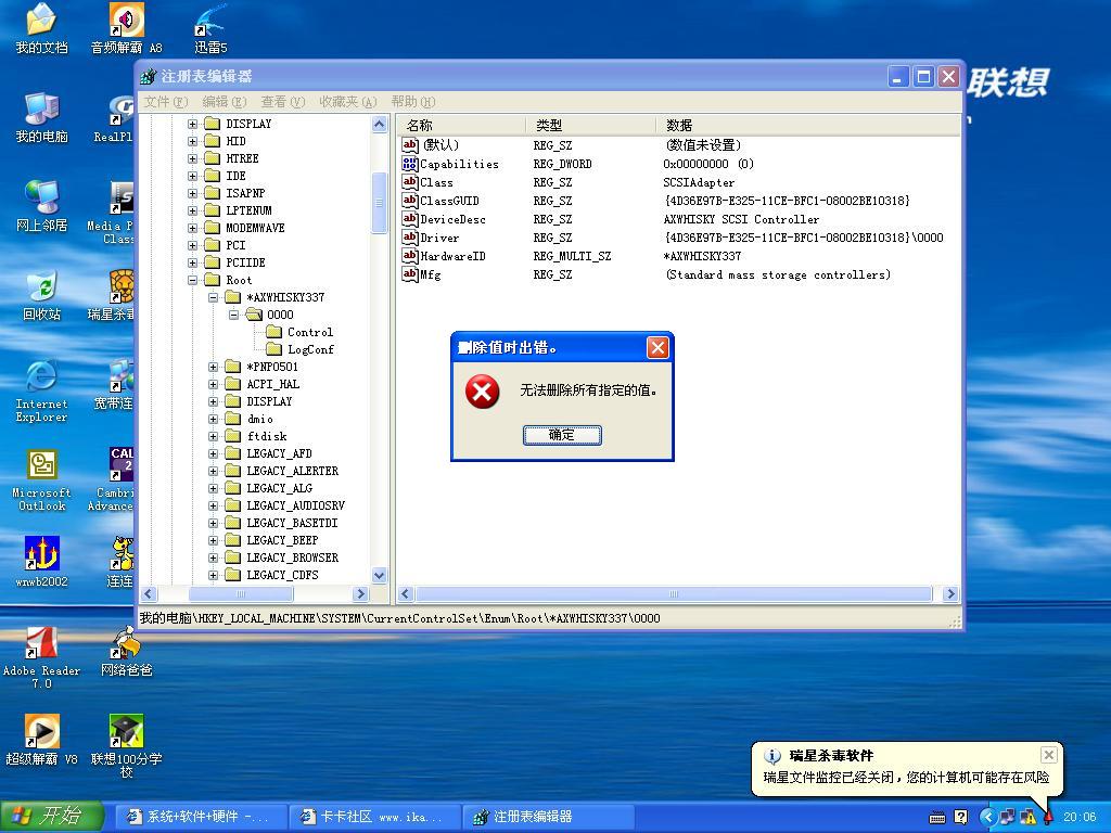 【matp的贴子】我以前安过alcohol120%,但不好使,我就把它删了,但电脑以后每次开机都显示有新硬件名是AXWHISKY SCSI Controller,而且计算机也无法安装,因为没有安装程序,那位高手能告诉我那是什么东西,能去掉吗?