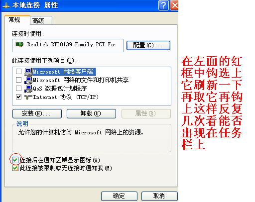 控制面板-网络连接-本地连接-属性-连接后在通知区域显示 打√