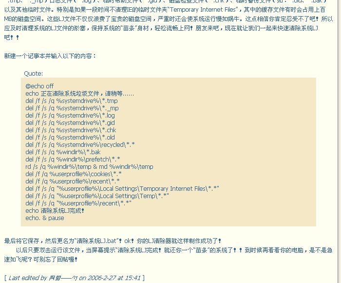 关于批处理的运用,可以说博大精深,变化莫测,我也只懂个皮毛,只能为大家提供怎么多,希望大家能够用DOS命令去优化它,这样才能让其更好的为我们服务。
