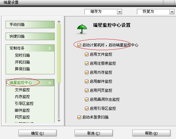 在右下脚的瑞星图标上单击鼠标右键——开启所有监控