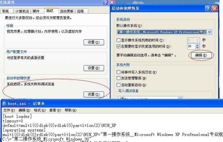 鼠标指到“我的电脑”击右键→“属性”→“高级”→系统启动,系统失败和调试信息→击“设置”→“编辑”即可打开BOOT.INI文件,参见下图