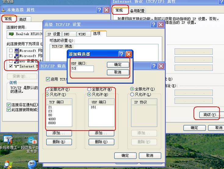 默认情况下,Windows有很多端口是开放的,在你上网的时候,网络病毒和黑客可以通过这些端口连上你的电脑。为了让你的系统变为铜墙铁壁,应该封闭这些端口,主要有:TCP