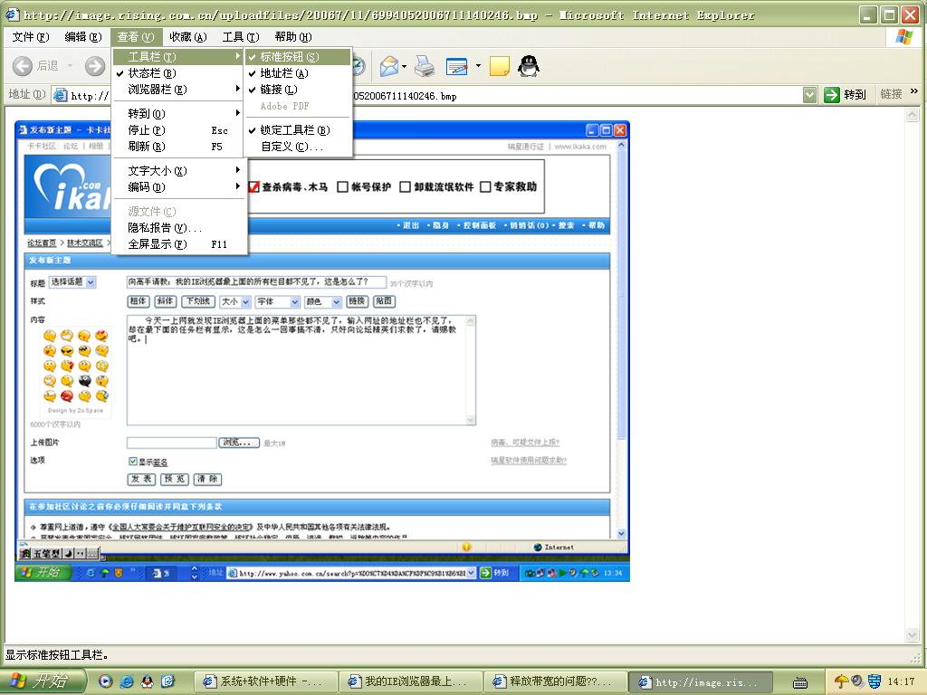 我的IE浏览器最上面的所有栏目都不见了,高手们帮助一下
