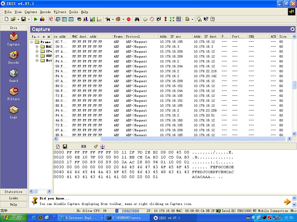 局域网内出现大量ARP->Request数据包,使得网络不通,请高手指点!!!!!