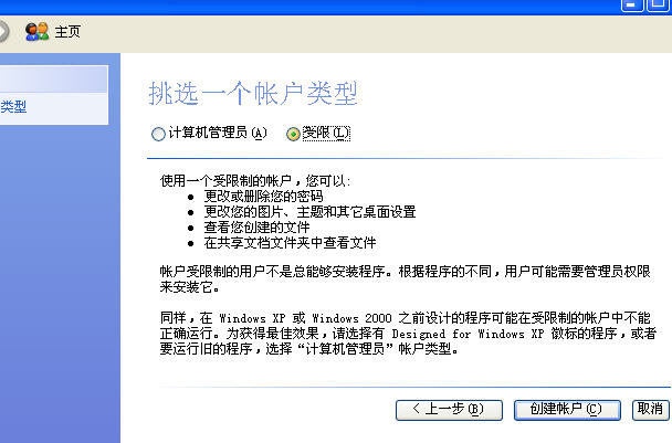 控制面版里-用户帐户-创建一个新的帐户-写好名字后-就选