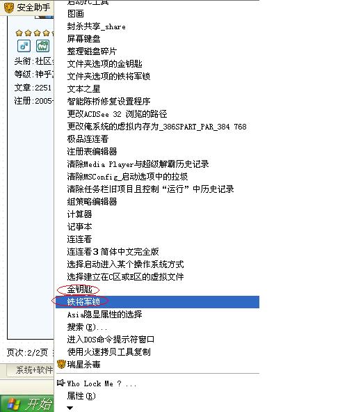 俺的方法其实并不复杂,只要事先设置好以后全部弄到右键菜单里去,它只修改注册表而已,并不改变其它的,比如:要锁住它,将其弄成“铁将军锁”要解开它,弄成“金钥匙”你不说他人怎么会清楚是做啥的啊?要用时只要鼠标指到开始击右键即可,看看下面俺的鼠标右键菜单。