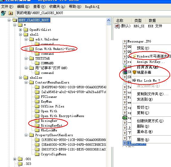 在“开始”→“运行”→输入“REGEDIT”回车,参见下图所示找到红框中你的右键中相对应项删除即可,但是首先在操作之前要作个注册表所对应键值备份,如果有误操作还可以还原它。