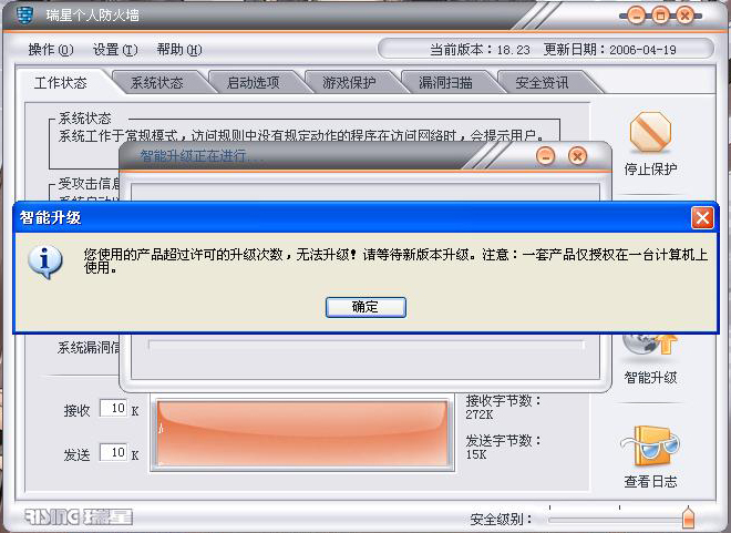 刚才在升级防火墙,突然停止并告知什么超过许可的升级次数,无法升级。请等待新版本升级。末了还说,注意,一套产品仅授权在一台计算机上使用……