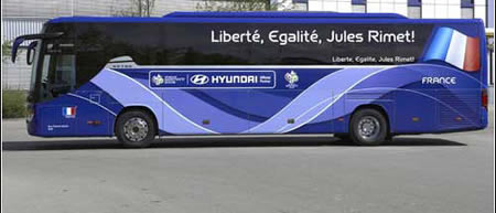 法国队大巴,口号是liberate,egalite,jules rimet!(自由、平等、儒勒斯-雷米特)