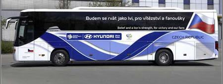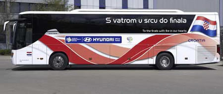 克罗地亚队大巴,口号是to the finals with fire in our hearts(带着我们心中的火坚持到底)