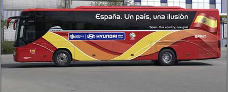 西班牙队大巴,口号是spain,one country,one goal(西班牙,一个国家,一个目标)