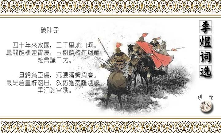 以阶下囚的身份对亡国往事作痛定思痛之想,自然不胜感慨系之。上片回顾事国时的繁华逸乐;那四十年来的家国基业;三千里地的辽阔疆域,竟都沉浸在一片享乐安逸之中。“几曾识干戈”既是其不知珍惜的结果,同时也是沦为臣虏的原因。下片记叙离别故国时哭辞宗庙的情景,写来尤为沉痛惨怛。其事虽见载于《东坡志林》但出自后主之手,更觉凄惨苦涩,不失为一个丧国之君内心的痛苦自白。