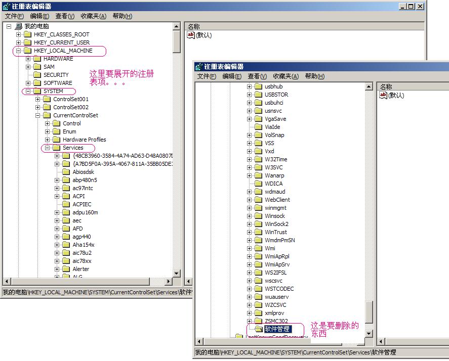 删除左栏中的病毒服务 "名管理软件"