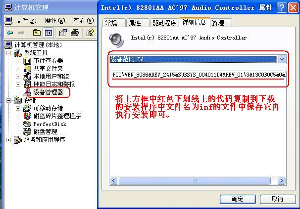 试试再鼠标指到“我的电脑”上右击选择“管理”→“设备管理”中打开声卡属性→在属性中点击“详细信息”这项如下图:这样在你下载的驱动程序中找它的一个扩展名为“inf”“smwdmv13.inf”的文件一个安装文件打开它,找到[AnalogDevices]这项下以相同的格式添加自己下图的ID号,→参见下图所示操作即可。