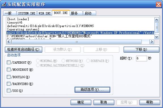 系统配置衫程序里面没有boot.ini这个选项啊?三楼的兄弟,剩下的几个选项都有!