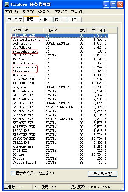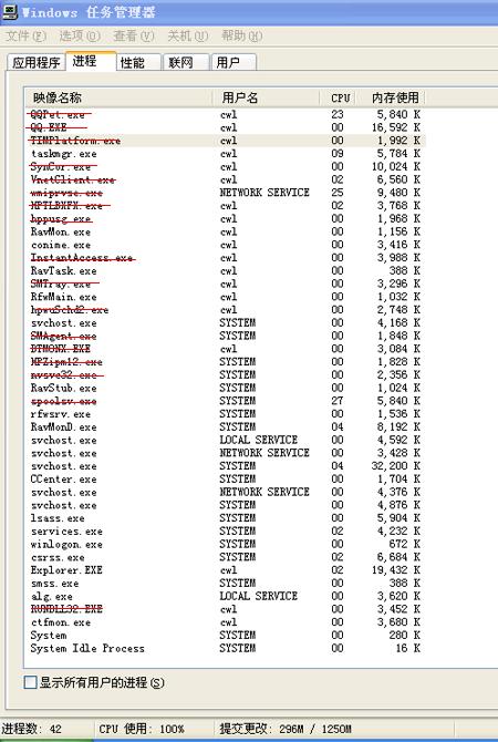 你所划的进程我只找到一个(taskmgr.exe),结束后又会出现.其它进程我也不知道哪个是无关紧要的.