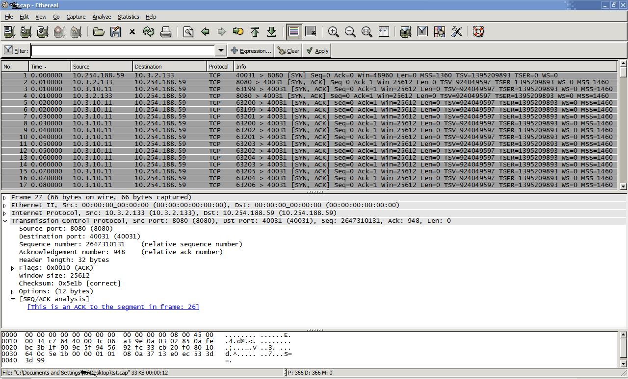 如图,网络抓包发现有10.3.2.133到10.254.188.59的(SYN,ACK)报文,被恶意复制,修改源地址为10.3.10.11(实际上不存在这个地址)后向不同端口大量发送,导致网络瘫了。后面10.3.2.133到10.254.188.59的ACK报文也被复制后发送。不知道是中了什么病毒会有这样的症状。
