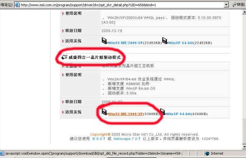 你应该下载我用红圈圈住的地方,,你却下载了我用第二个红圈圈住的旁边(WinXP 64-bit(6268KB)) 你应该要下载Win9X/ME/2000/XP(5308KB) 才是正确的
