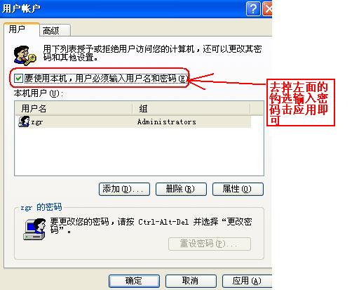 在“开始”→“运行”→输入“control.exe userpasswords2”进入“用户帐户”参见下图红框中所示: