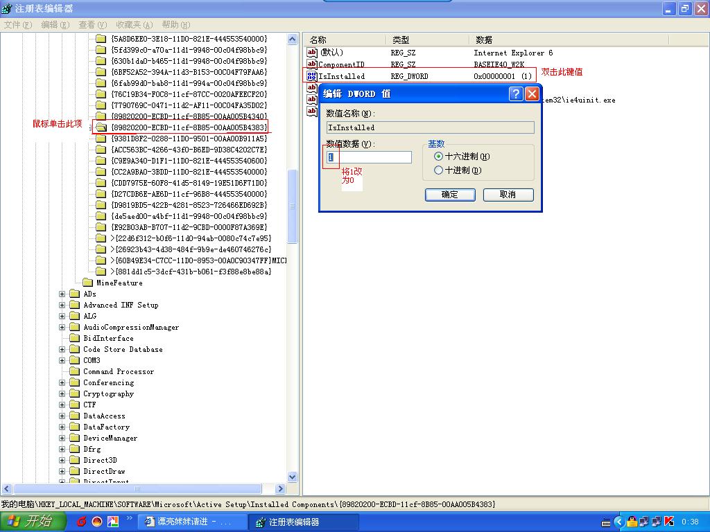 启动注册表编辑器Regedit,找到HKEY_LOCAL_MACHINE\SOFTWARE\Microsoft\ActiveSetup\InstalledComponents\{89820200-ECBD-11cf-8B85-00AA005B4383},把该键的值从1改为0,XP将自动开始安装IE.(建议直接用这个修改注册表键值的方法)