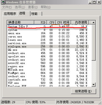 这个进程在不用电脑的时候一般会达到90%以上,如果没有达到这个标准,那你的系统就中毒了!