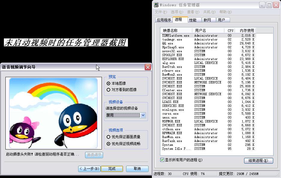 这是QQ的视频调节截图,下图是未启动视频时的任务管理器截图: