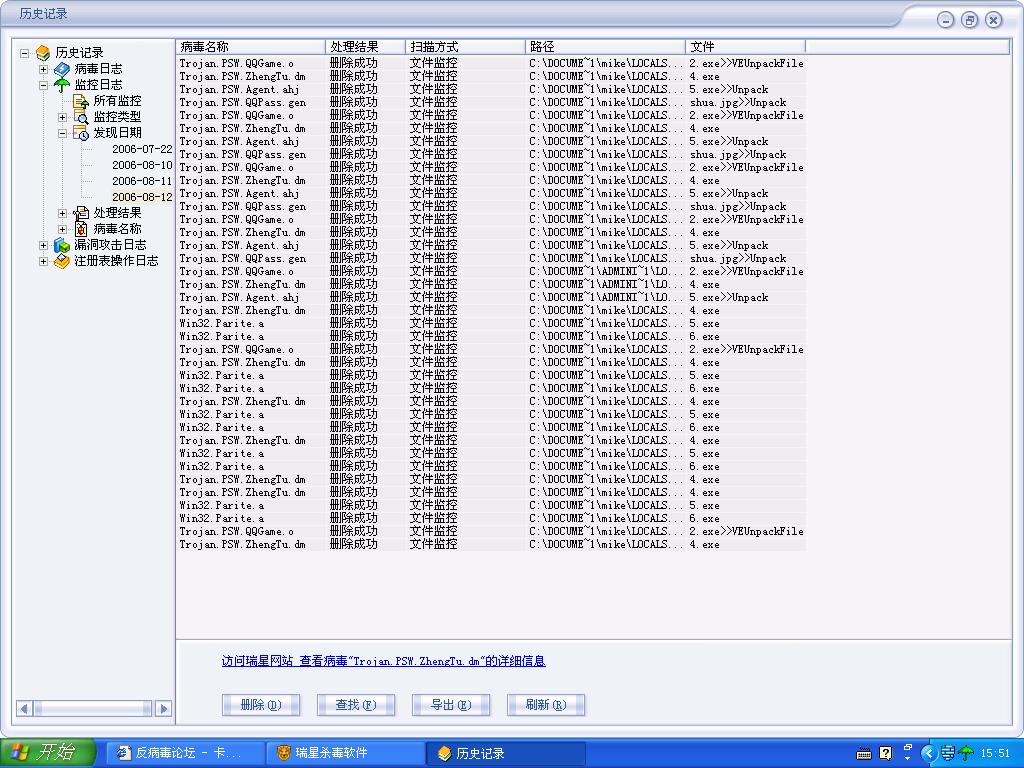 可是没多久防火墙又提示删除病毒成功后,再当我扫描日志和用冰箭查看时又出现了