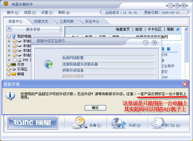 是每天升级吗,我现在升级一直都是提示 已经是最新版本,暂时不有升级, 我今天有给另一台机装我的瑞星号,可是那台在升级的时候 提示 不能升级,说此产品是一对一的, 什么意思啊, 是因为我升级了,所以那台电脑出现这样的提示吗, 那下次我如果被盗走的人先升级, 我的电脑是不是也是这样的提升啊
