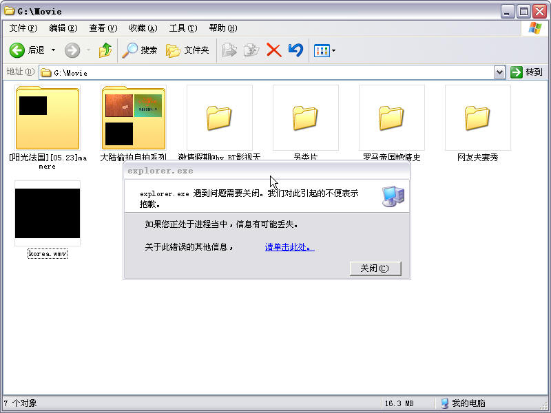 刚做的系统,感觉都很好,但用了二天后就出现一个问题,就是在打开放电影的文件夹报错,只要打开就报错,除了这个文件夹以外开什么都没有问题,问一下这到底是怎么回事,急死人了,请看图: