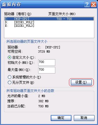 我的电脑”→属性→高级→性能 设置→高级→虚拟内存 更改→选择虚拟内存(页面文件)存放的分区→自定义大小