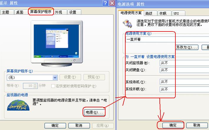 鼠标指到桌面空白处击右键→“属性”→“屏幕保护程序”卡→“电源”→按如图红框所示操作即可