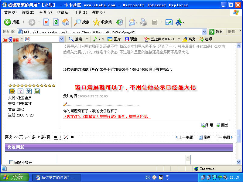 【百果来问问题的贴子】还是不行 情况基本和原来差不多 只变了一点 就是最后打开的IE是什么状态 然后关光再打开的IE就是什么状态 不过进入里面的连接还是全屏而不是最大化