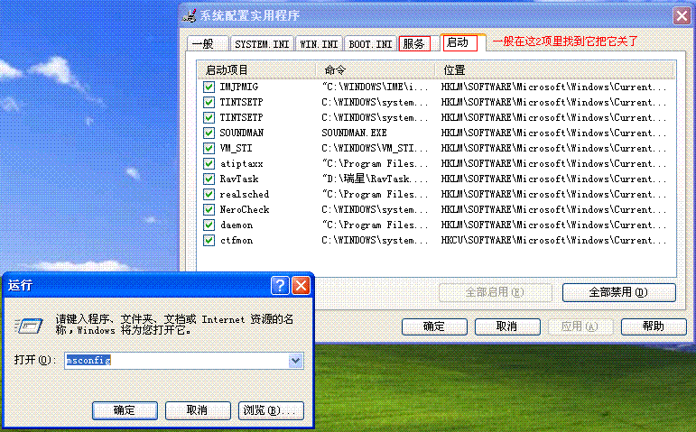 好了 我在REGEDIT里直接删除就好了 至于msconfig里面没有找到,谢谢了