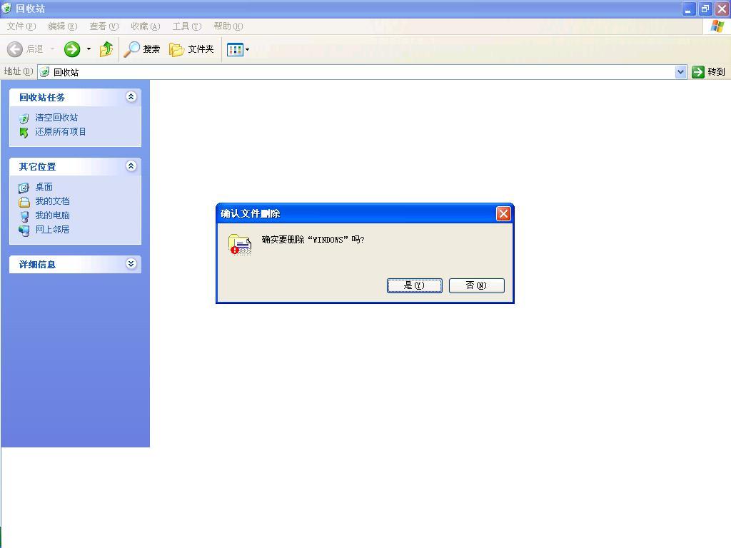 今天我看回收站的图标里有东西(意思表明回收站里有东西),打开看看,什么也没有,我显示所有文件包括系统文件也看不到什么东西,但我按清空回收站是弹出一个对话框:你确实要删除“WINDOWS”吗,我按否,连忙搜索这个文件夹,发现在回收站里找不到任何文件,这是为什么?