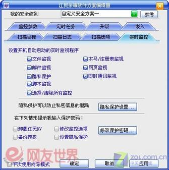 运行木马防御大师后,点击界面中的“实时监控”按钮,在实时监控界面中,开启“系统保护”和“实时监控”功能(如图5)。再勾选“智能防护”和“IE漏洞保护”中的所有选项,木马防御大师的内核级别的保护技术,即可防止任何未知的捆绑插件、木马病毒进入我们的系统,捆绑在其它程序或加壳的QQ大盗一样躲不过大师的火眼!