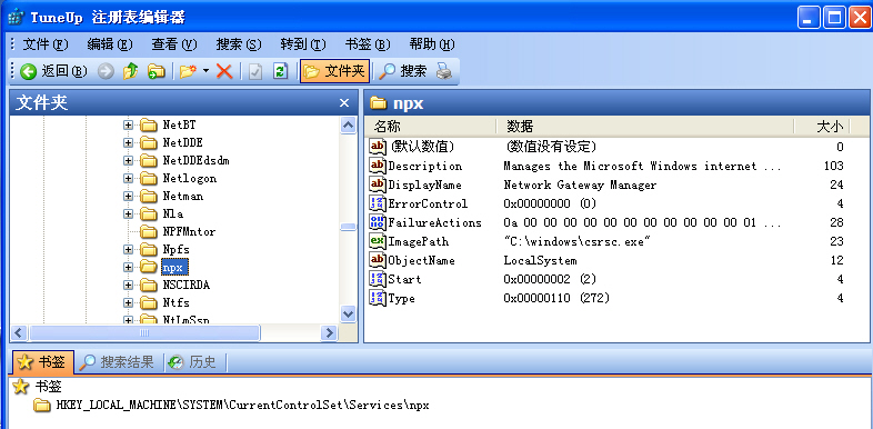 7、csrsc.exe(注意:不是“csrse.exe”)注册系统服务:HKEY_LOCAL_MACHINE\SYSTEM\CurrentControlSet\Services\npx,指向:c:\windows\csrsc.exe。