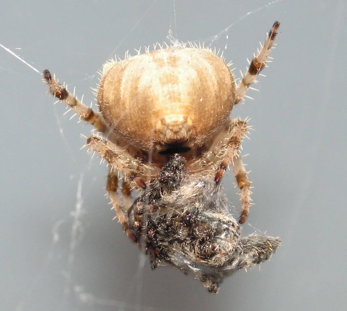 昨天下午,2只同种的蜘蛛(尽管颜色不同),在一张网上打了起来。我立马跑去拿相机,回来一看,竟出现如下一幕...