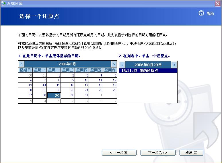 经第二步主要是选择还原点的位置,还原点可以是日历中的某个时间,也可以是自己创建的某个还原点,还可以是安装某个特定程序时创建的特定还原点。