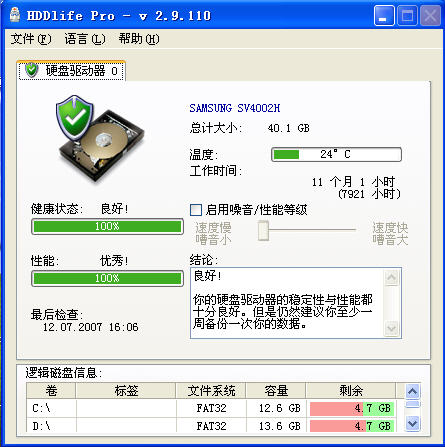 一款不错检测硬盘的运行时间,温度,健康态和性能好软件与大家分享一下