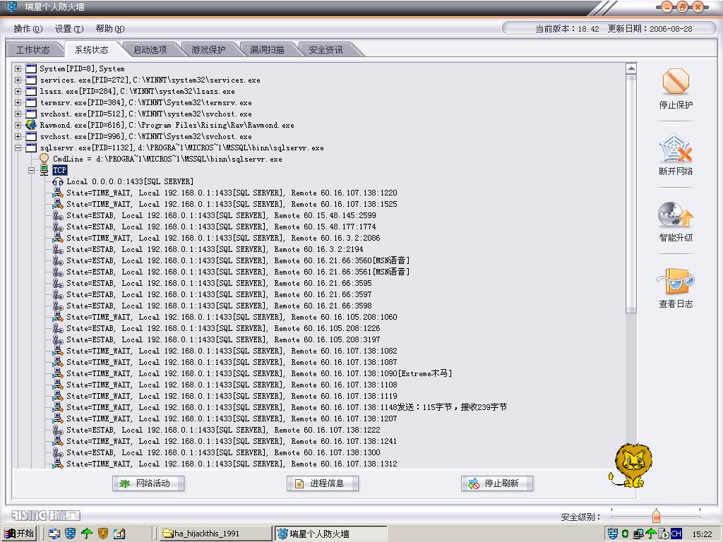 最近服务器经常出现SQL不好使的情况,扫描术马几乎天天都杀到(backdoor-****),文件名为hack.com.cn.exe;hack.com.cn.bat,瑞星提示已杀掉,但是第二天十有八九还会也来,弄的我的SQL服务经常被堵死,查看防火墙发现SQL的TCP中有很多60.*******一些外网的IP在访问1433SQL端口,我该怎么办呐!!!!!!!!!!!!!!!!!!求求大侠们了.
