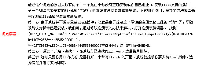 昨天用瑞星远程求助,从上午九点一直整到下午3点多,以为问题解决了,可是今天上网,发现所有的FLASH都打不开.我的机子已经装了FLASH PLAYER 9.0,在网上搜索一翻,如下文章试过了,打开有FLASH的,也没提示我要安装,而且现在,也无法用CTRL+SHIFT在中英文打字中切换了.哪位高手帮帮小女子!!!!