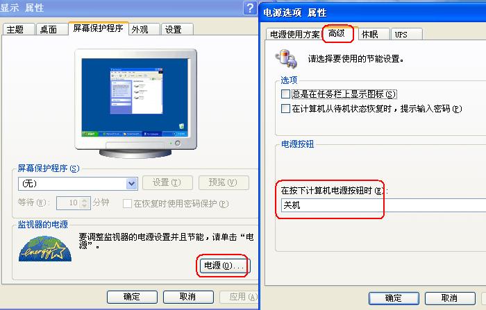 鼠标指到参见下桌面空白处击右键→“属性”→“屏幕保护程序”卡→“电源”→参见下图红框所示